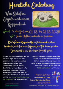 Ihr seid herzlich eingeladen uns zu besuchen. Egal, ob alleine oder zusammen mit anderen, egal, ob Kindergarten, Schule oder Erwachsene, egal, ob Ihr die Geschichte von der Jesu Geburt schon auswendig kennt oder noch nie davon gehört habt. Hier seid Ihr richtig. Die Kirche ist in dieser Zeit jeweils von Donnerstag bis Sonntag von 15:00 bis 18:00 Uhr für alle geöffnet.