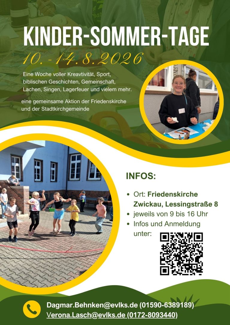 Die Friedenskirche Zwickau und die Stadtkirchgemeinde Zwickau laden herzlich ein zu den diesjährigen Kinder-Sommer-Tagen.