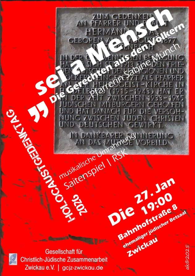 Die Gesellschaft für Christlich-Jüdische Zusammenarbeit Zwickau lädt ein zu einem besonderen Vortrag von Pfarrerin Sabine Münch am Holocaustgedenktag. Die musikalische Umrahmung gestaltet Saitenspiel/RSK.